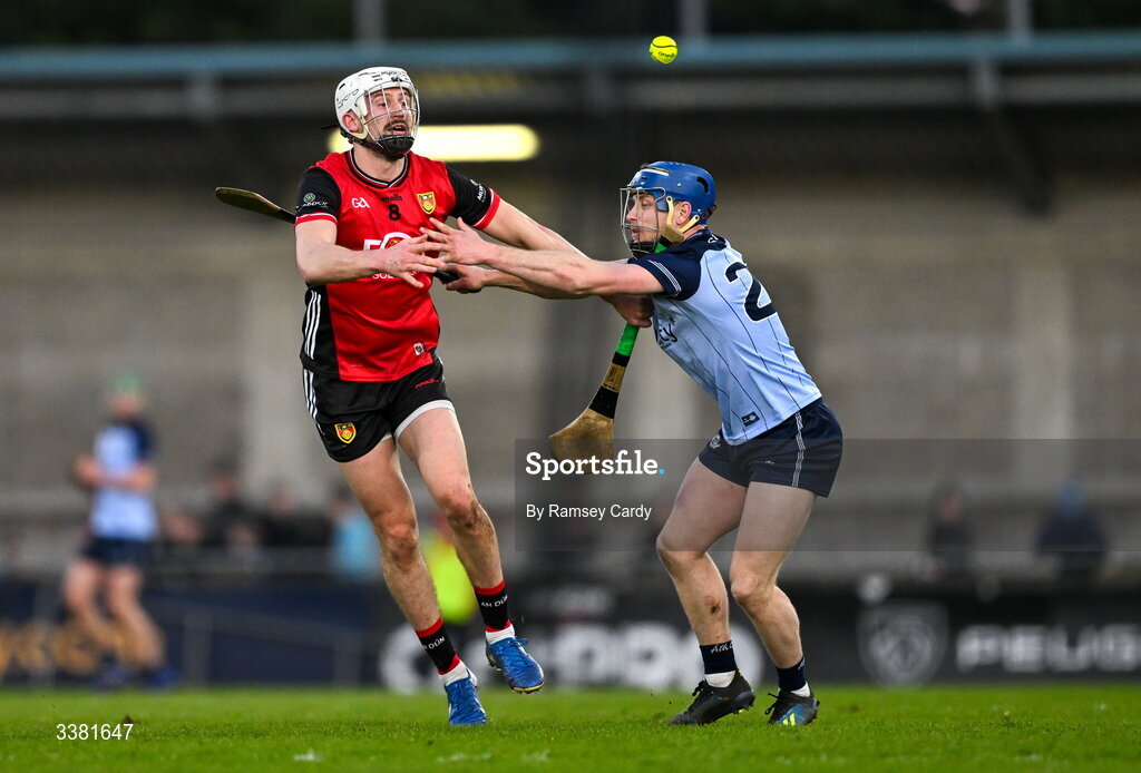 7 March 2026; Donal Hughes of Down in action against Davy Keogh of Dublin during the Allianz Hurling League Division 1B match between Dublin and Down at Parnell Park in Dublin. Photo by Ramsey Cardy/Sportsfile