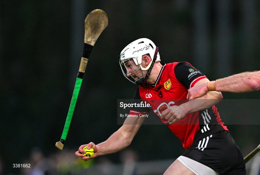 7 March 2026; Donal Hughes of Down evades the hurl of John Hetherton of Dublin during the Allianz Hurling League Division 1B match between Dublin and Down at Parnell Park in Dublin. Photo by Ramsey Cardy/Sportsfile