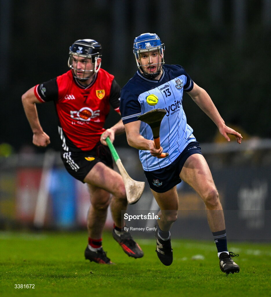 7 March 2026; Dara Purcell of Dublin in action against Liam Savage of Down during the Allianz Hurling League Division 1B match between Dublin and Down at Parnell Park in Dublin. Photo by Ramsey Cardy/Sportsfile