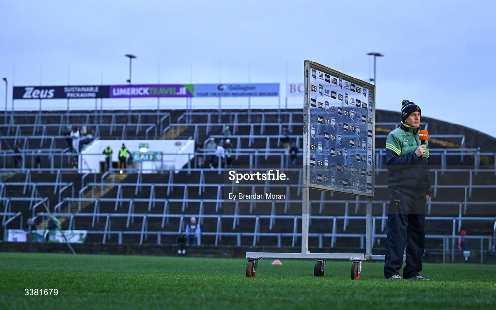7 March 2026; Limerick manager John Kiely is interviewed by TG4 before the Allianz Hurling League Division 1A match between Limerick and Cork at TUS Gaelic Grounds in Limerick. Photo by Brendan Moran/Sportsfile