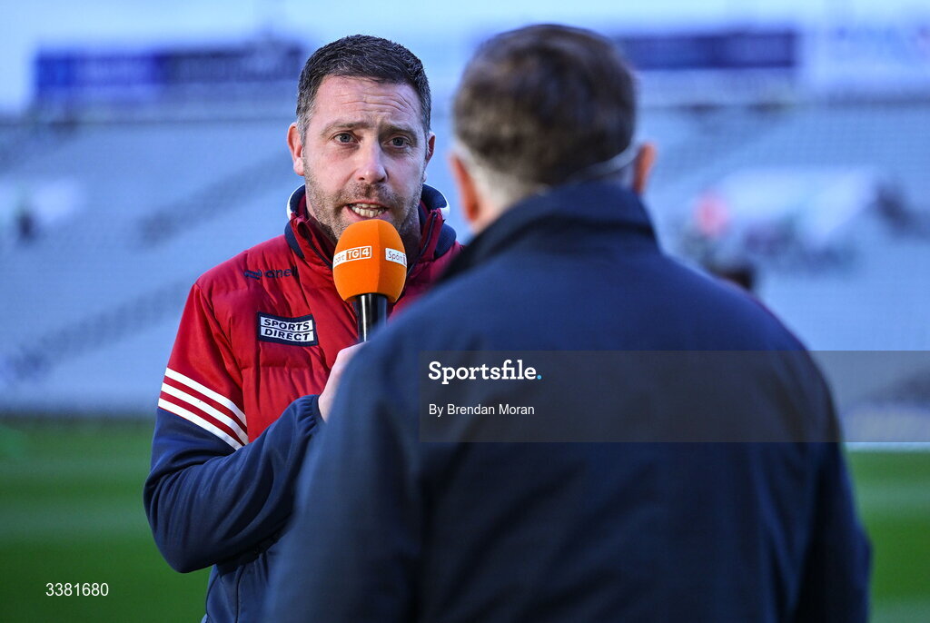 7 March 2026; Cork selector Ronan Curran is interviewed by Micheál Ó Domhnaill of TG4 before the Allianz Hurling League Division 1A match between Limerick and Cork at TUS Gaelic Grounds in Limerick. Photo by Brendan Moran/Sportsfile