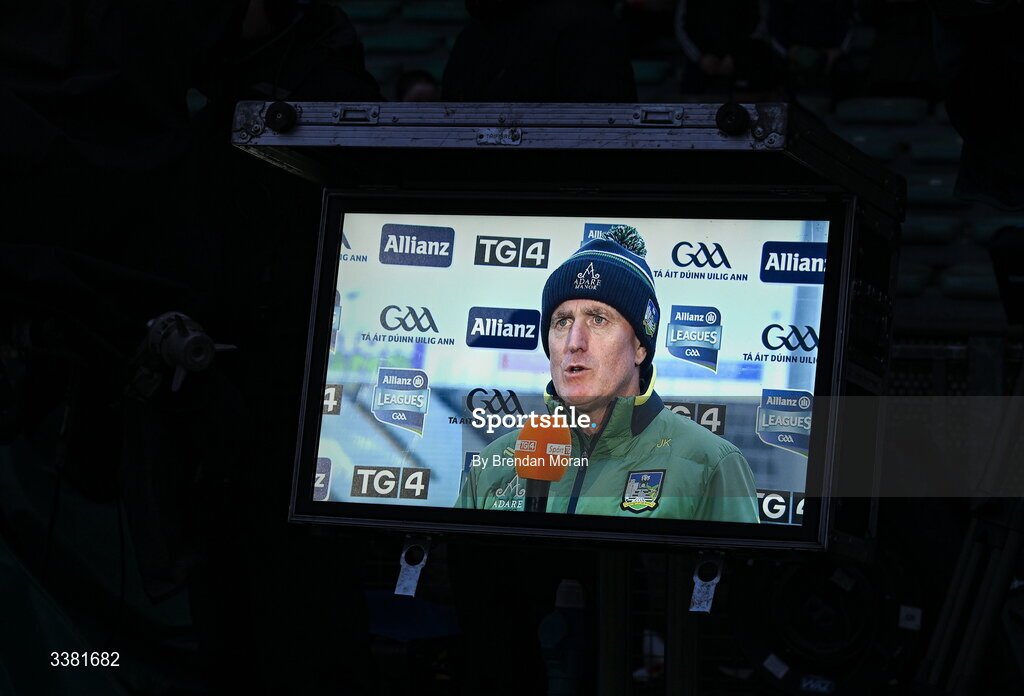 7 March 2026; Limerick manager John Kiely is seen on a TV minotor as he interviewed by TG4 before the Allianz Hurling League Division 1A match between Limerick and Cork at TUS Gaelic Grounds in Limerick. Photo by Brendan Moran/Sportsfile