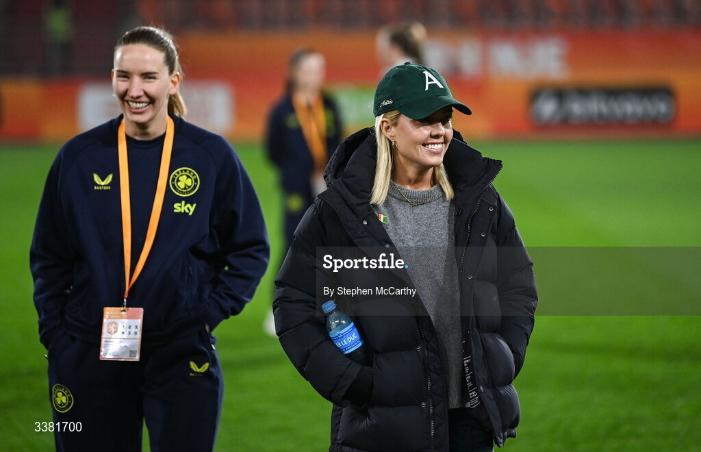 7 March 2026; Denise O’Sullivan, right, and Sophie Whitehouse of Republic of Ireland before the 2027 FIFA Women’s World Cup Qualifier match between the Netherlands and Republic of Ireland at Stadion Galgenwaard in Utrecht, Netherlands. Photo by Stephen McCarthy/Sportsfile