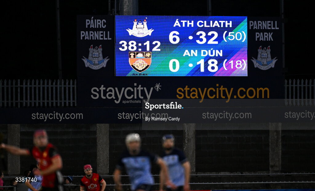 7 March 2026; A general view of the scoreboard in the final moments of the Allianz Hurling League Division 1B match between Dublin and Down at Parnell Park in Dublin. Photo by Ramsey Cardy/Sportsfile