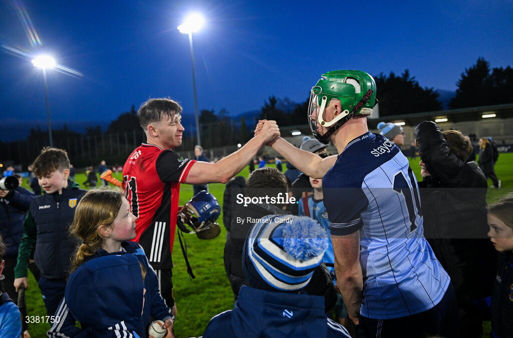7 March 2026; Fergal Whitely of Dublin and Paul Sheehan of Down after the Allianz Hurling League Division 1B match between Dublin and Down at Parnell Park in Dublin. Photo by Ramsey Cardy/Sportsfile