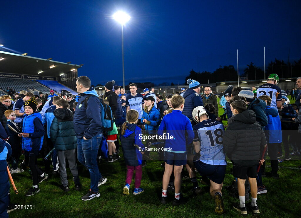 7 March 2026; Dublin players, including David Lucey, 18, signs autographs after the Allianz Hurling League Division 1B match between Dublin and Down at Parnell Park in Dublin. Photo by Ramsey Cardy/Sportsfile