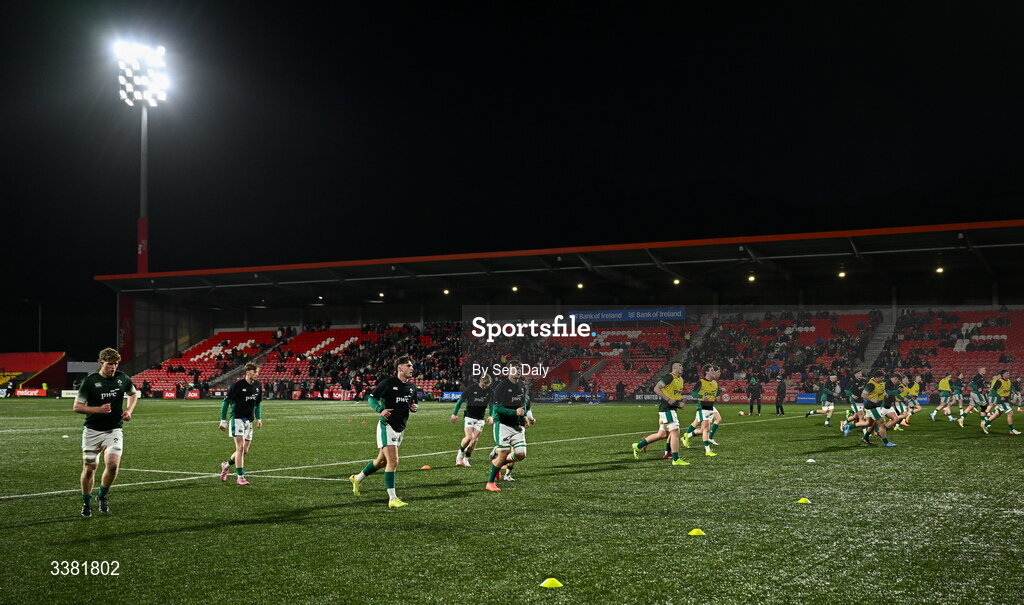 7 March 2026; Ireland players warm-up before the U20 Six Nations Rugby Championship match between Ireland and Wales at Virgin Media Park in Cork. Photo by Seb Daly/Sportsfile