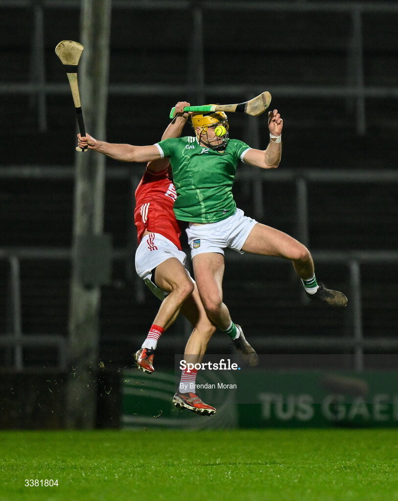 7 March 2026; Cathal O’Neill of Limerick in action against Micheál Mullins of Cork during the Allianz Hurling League Division 1A match between Limerick and Cork at TUS Gaelic Grounds in Limerick. Photo by Brendan Moran/Sportsfile