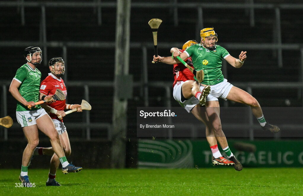 7 March 2026; Cathal O’Neill of Limerick in action against Micheál Mullins of Cork during the Allianz Hurling League Division 1A match between Limerick and Cork at TUS Gaelic Grounds in Limerick. Photo by Brendan Moran/Sportsfile