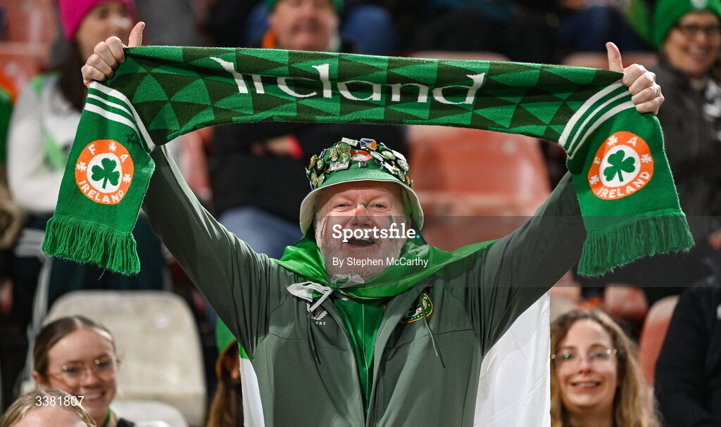 7 March 2026; Republic of Ireland supporters before the 2027 FIFA Women’s World Cup Qualifier match between the Netherlands and Republic of Ireland at Stadion Galgenwaard in Utrecht, Netherlands. Photo by Stephen McCarthy/Sportsfile