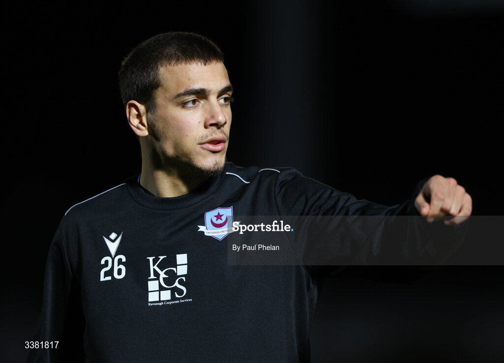7 March 2026; Michael Cardo of Drogheda United warms up before the SSE Airtricity Men's Premier Division match between Sligo Rovers and Drogheda United at The Showgrounds in Sligo. Photo by Paul Phelan/Sportsfile