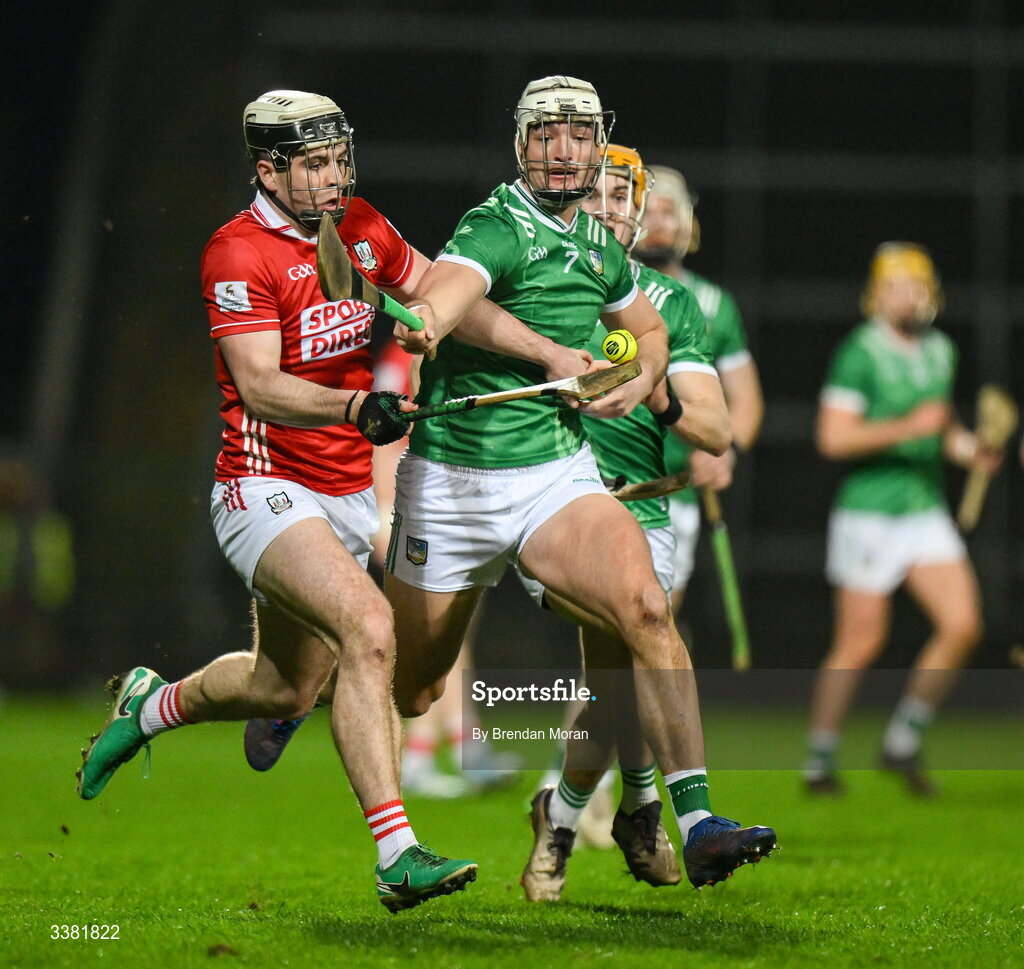 7 March 2026; Barry Walsh of Cork is tackled by Kyle Hayes of Limerick during the Allianz Hurling League Division 1A match between Limerick and Cork at TUS Gaelic Grounds in Limerick. Photo by Brendan Moran/Sportsfile
