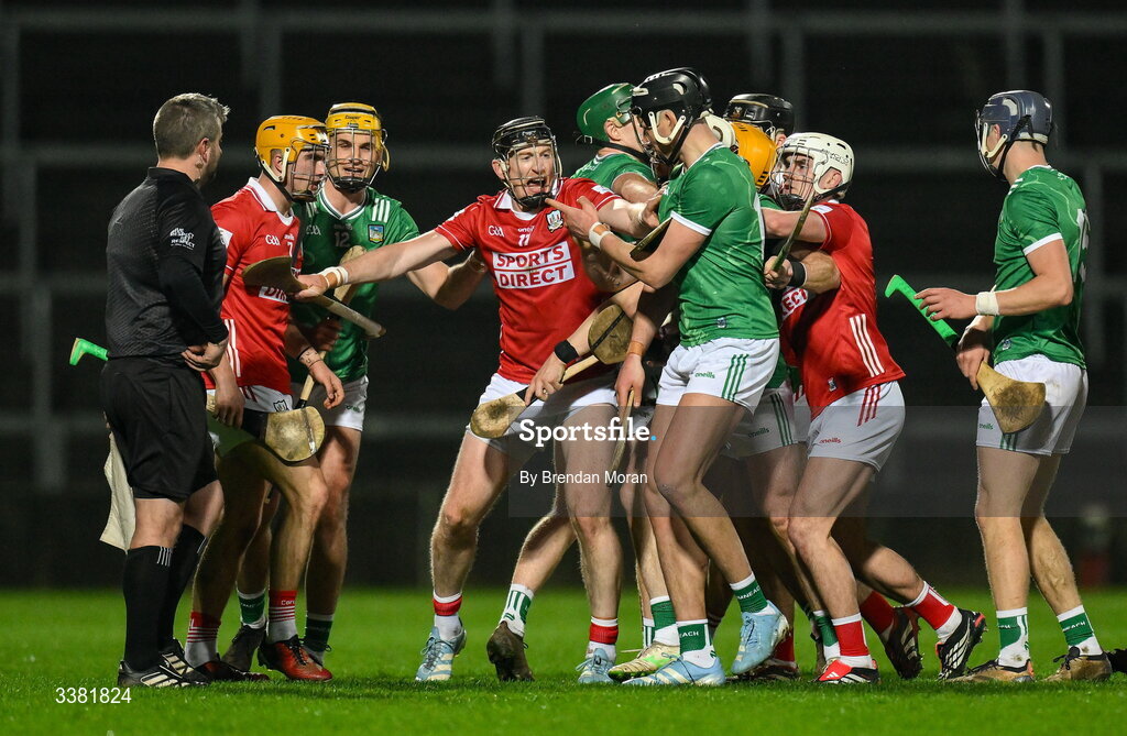 7 March 2026; Damien Cahalane of Cork attempts to seperate players during a tussle during the Allianz Hurling League Division 1A match between Limerick and Cork at TUS Gaelic Grounds in Limerick. Photo by Brendan Moran/Sportsfile