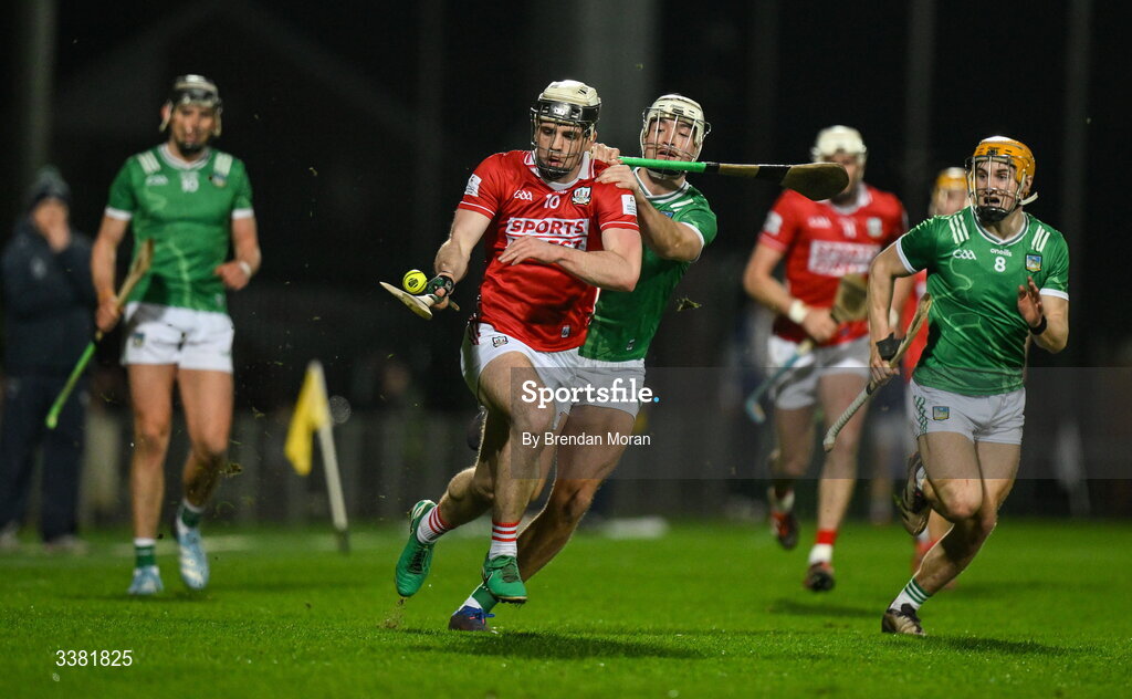 7 March 2026; Barry Walsh of Cork is tackled by Kyle Hayes of Limerick during the Allianz Hurling League Division 1A match between Limerick and Cork at TUS Gaelic Grounds in Limerick. Photo by Brendan Moran/Sportsfile
