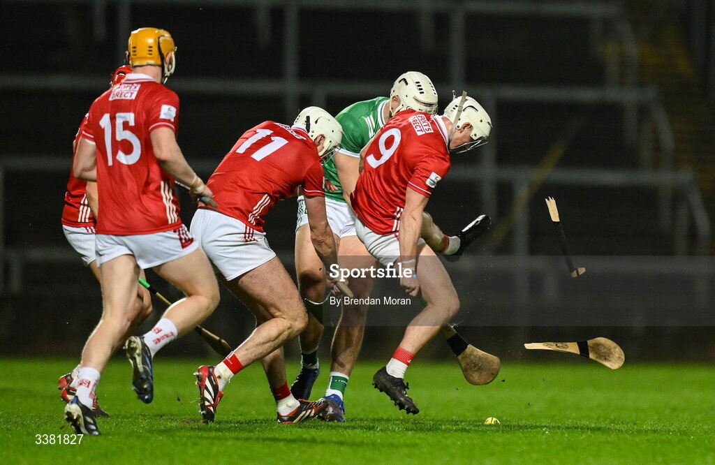 7 March 2026; Kyle Hayes of Limerick breaks his hurley in a clash with Tommy O’Connell of Cork during the Allianz Hurling League Division 1A match between Limerick and Cork at TUS Gaelic Grounds in Limerick. Photo by Brendan Moran/Sportsfile
