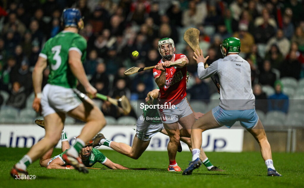 7 March 2026; Shane Kingston of Cork has a shot saved by Limerick goalkeeper Nickie Quaid during the Allianz Hurling League Division 1A match between Limerick and Cork at TUS Gaelic Grounds in Limerick. Photo by Brendan Moran/Sportsfile
