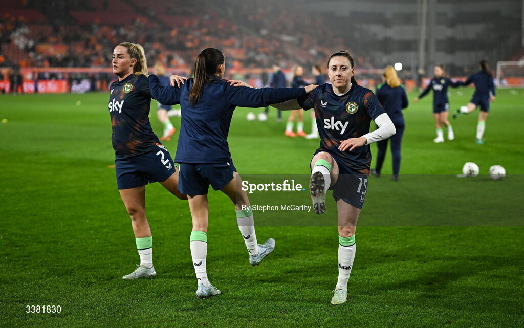 7 March 2026; Lucy Quinn of Republic of Ireland, right, before the 2027 FIFA Women’s World Cup Qualifier match between the Netherlands and Republic of Ireland at Stadion Galgenwaard in Utrecht, Netherlands. Photo by Stephen McCarthy/Sportsfile