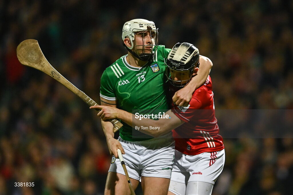 7 March 2026; Aaron Gillane of Limerick tussles with Ger Millerick of Cork during the Allianz Hurling League Division 1A match between Limerick and Cork at TUS Gaelic Grounds in Limerick. Photo by Tom Beary/Sportsfile