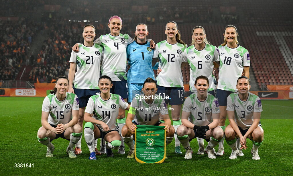 7 March 2026; The Republic of Ireland team, top row, from left, Emily Murphy, Caitlin Hayes, goalkeeper Courtney Brosnan, Anna Patten, Megan Connolly and Kyra Carusa, bottom row, from left, Lucy Quinn, Marissa Sheva, Katie McCabe, Aoife Mannion and Chloe Mustaki before the 2027 FIFA Women’s World Cup Qualifier match between the Netherlands and Republic of Ireland at Stadion Galgenwaard in Utrecht, Netherlands. Photo by Stephen McCarthy/Sportsfile