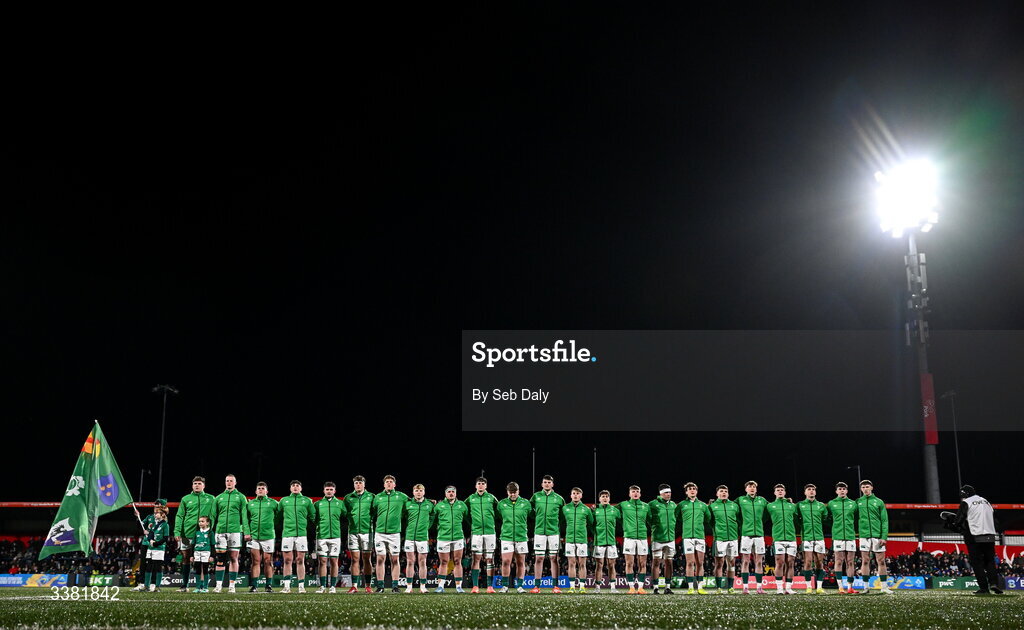 7 March 2026; Ireland players during the national anthems before the U20 Six Nations Rugby Championship match between Ireland and Wales at Virgin Media Park in Cork. Photo by Seb Daly/Sportsfile
