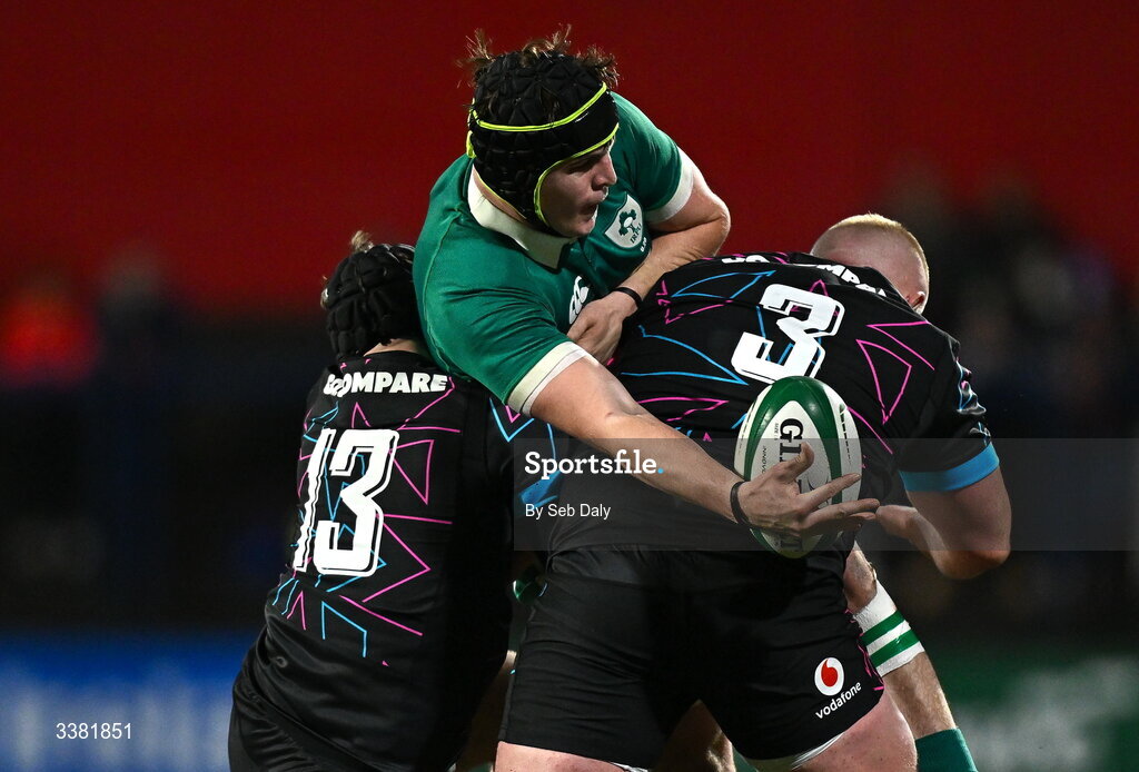 7 March 2026; Josh Neill of Ireland is tackled by Wales players Osian Darwin-Lewis, left, and Jac Pritchard during the U20 Six Nations Rugby Championship match between Ireland and Wales at Virgin Media Park in Cork. Photo by Seb Daly/Sportsfile