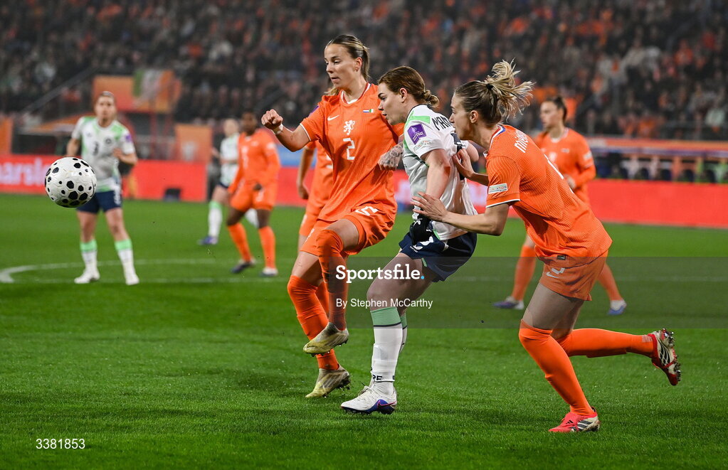 7 March 2026; Aoife Mannion of Republic of Ireland in action against Lynn Wilms, left, and Vivianne Miedema of Netherlands during the 2027 FIFA Women’s World Cup Qualifier match between the Netherlands and Republic of Ireland at Stadion Galgenwaard in Utrecht, Netherlands. Photo by Stephen McCarthy/Sportsfile