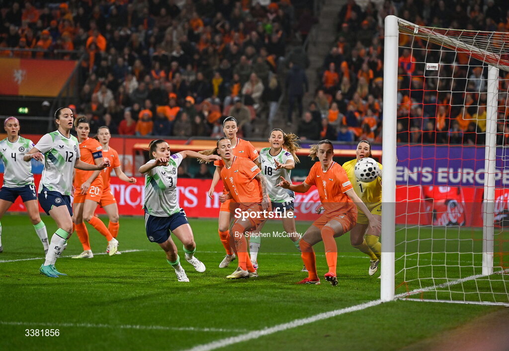 7 March 2026; Players from both side's watch the ball go past the post following a deflection from Lynn Wilms of Netherlands, centre, during the 2027 FIFA Women’s World Cup Qualifier match between the Netherlands and Republic of Ireland at Stadion Galgenwaard in Utrecht, Netherlands. Photo by Stephen McCarthy/Sportsfile