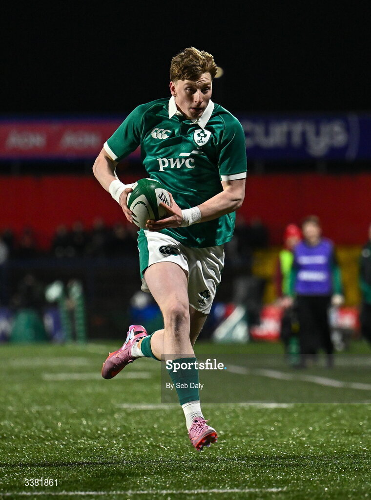 7 March 2026; Daniel Ryan of Ireland on his way to scoring his side's first try during the U20 Six Nations Rugby Championship match between Ireland and Wales at Virgin Media Park in Cork. Photo by Seb Daly/Sportsfile
