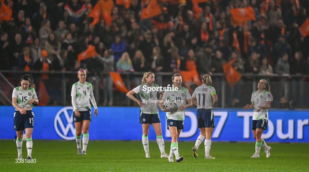 7 March 2026; Republic of Ireland players, from left, Lucy Quinn, Caitlin Hayes, Megan Connolly, Kyra Carusa, Katie McCabe and Chloe Mustaki react after their side concede a first goal during the 2027 FIFA Women’s World Cup Qualifier match between the Netherlands and Republic of Ireland at Stadion Galgenwaard in Utrecht, Netherlands. Photo by Stephen McCarthy/Sportsfile