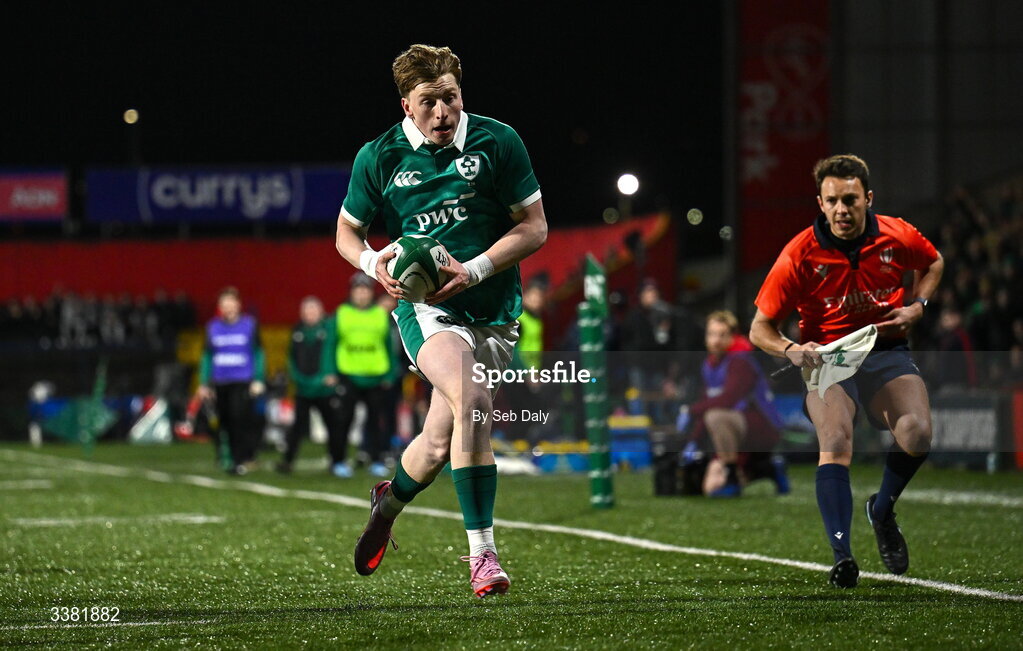 7 March 2026; Daniel Ryan of Ireland on his way to scoring his side's first try during the U20 Six Nations Rugby Championship match between Ireland and Wales at Virgin Media Park in Cork. Photo by Seb Daly/Sportsfile