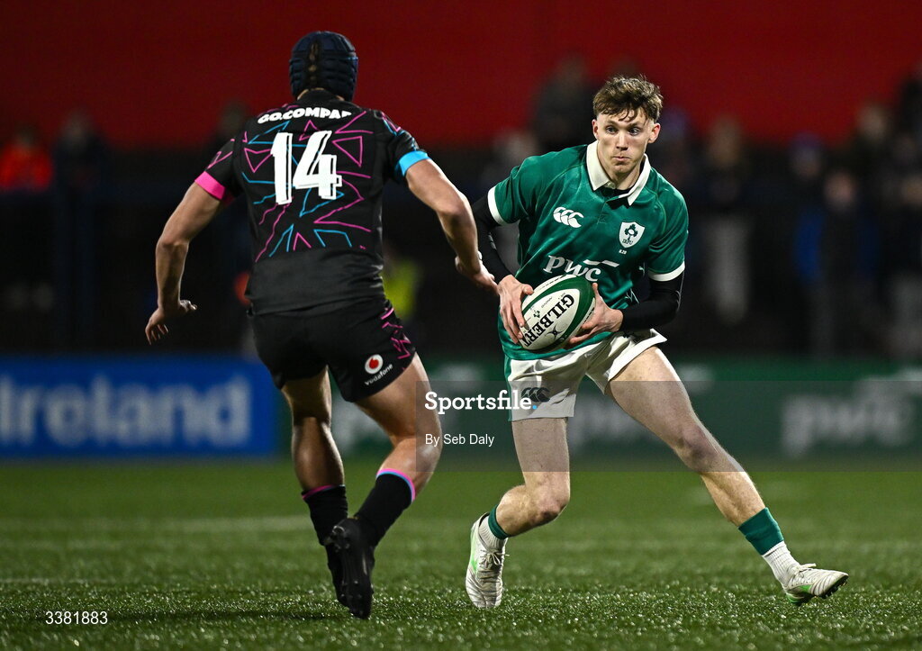 7 March 2026; Tom Wood of Ireland in action against Dylan Scott of Wales during the U20 Six Nations Rugby Championship match between Ireland and Wales at Virgin Media Park in Cork. Photo by Seb Daly/Sportsfile