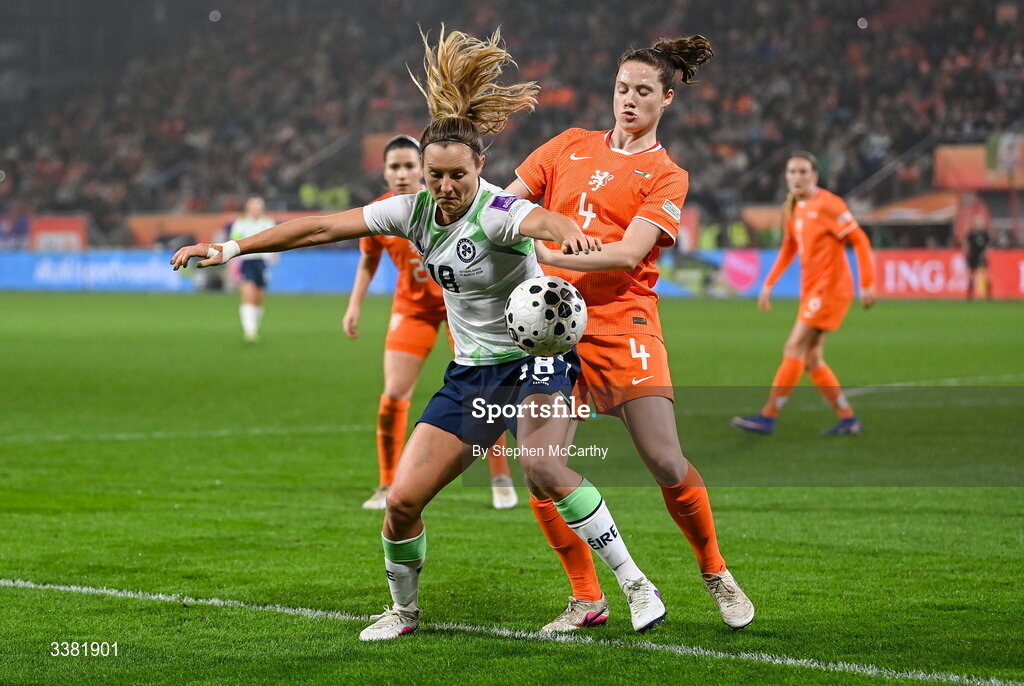 7 March 2026; Kyra Carusa of Republic of Ireland in action against Veerle Buurman of Netherlands during the 2027 FIFA Women’s World Cup Qualifier match between the Netherlands and Republic of Ireland at Stadion Galgenwaard in Utrecht, Netherlands. Photo by Stephen McCarthy/Sportsfile