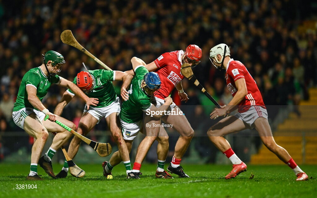 7 March 2026; From left, Adam English, Barry Nash and Mike Casey of Limerick in action against Brian Hayes, left and Alan Walsh of Cork during the Allianz Hurling League Division 1A match between Limerick and Cork at TUS Gaelic Grounds in Limerick. Photo by Tom Beary/Sportsfile