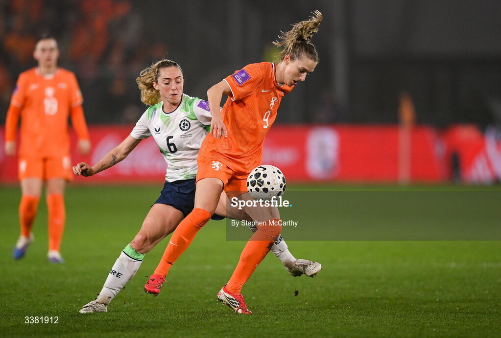 7 March 2026; Vivianne Miedema of Netherlands in action against Megan Connolly of Republic of Ireland during the 2027 FIFA Women’s World Cup Qualifier match between the Netherlands and Republic of Ireland at Stadion Galgenwaard in Utrecht, Netherlands. Photo by Stephen McCarthy/Sportsfile
