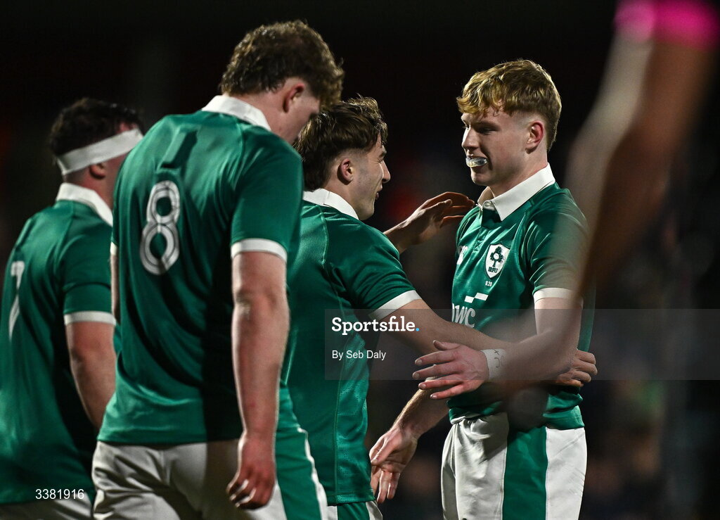 7 March 2026; Christopher Barrett of Ireland celebrates with teammate Rob Carney, right, after scoring their side's fourth try during the U20 Six Nations Rugby Championship match between Ireland and Wales at Virgin Media Park in Cork. Photo by Seb Daly/Sportsfile