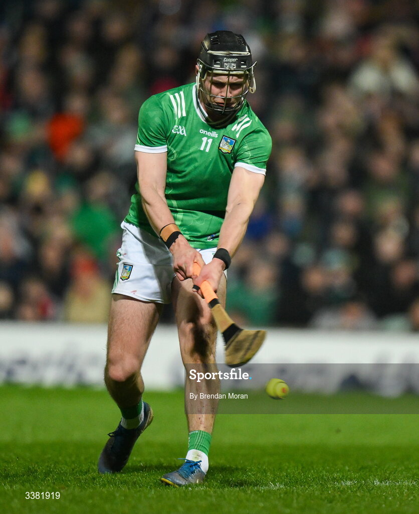 7 March 2026; Aidan O’Connor of Limerick scores his side's third goal from a penalty during the Allianz Hurling League Division 1A match between Limerick and Cork at TUS Gaelic Grounds in Limerick. Photo by Brendan Moran/Sportsfile