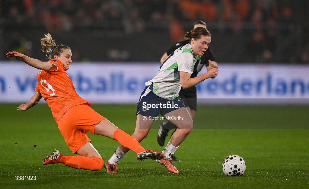 7 March 2026; Emily Murphy of Republic of Ireland in action against Vivianne Miedema of Netherlands during the 2027 FIFA Women’s World Cup Qualifier match between the Netherlands and Republic of Ireland at Stadion Galgenwaard in Utrecht, Netherlands. Photo by Stephen McCarthy/Sportsfile
