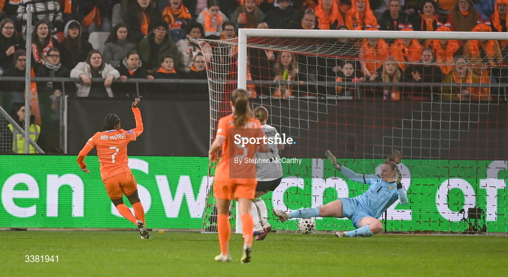 7 March 2026; Lineth Beerensteyn of Netherlands has a shot on goal saved by Republic of Ireland goalkeeper Courtney Brosnan during the 2027 FIFA Women’s World Cup Qualifier match between the Netherlands and Republic of Ireland at Stadion Galgenwaard in Utrecht, Netherlands. Photo by Stephen McCarthy/Sportsfile