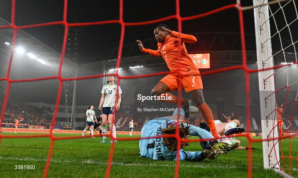 7 March 2026; Lineth Beerensteyn of Netherlands shoots to score her side's first goal during the 2027 FIFA Women’s World Cup Qualifier match between the Netherlands and Republic of Ireland at Stadion Galgenwaard in Utrecht, Netherlands. Photo by Stephen McCarthy/Sportsfile