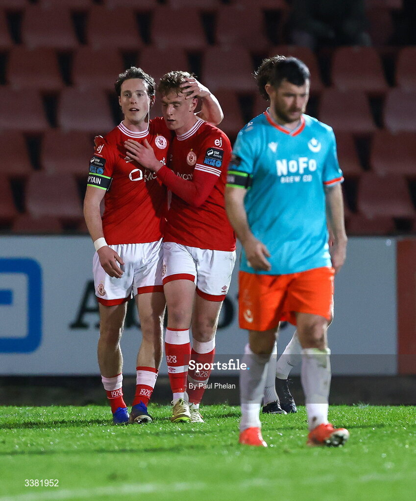 7 March 2026; Will Fitzgerald of Sligo Rovers celebrates after scoring his side's first goal with Daire Patton of Sligo Rovers during the SSE Airtricity Men's Premier Division match between Sligo Rovers and Drogheda United at The Showgrounds in Sligo. Photo by Paul Phelan/Sportsfile