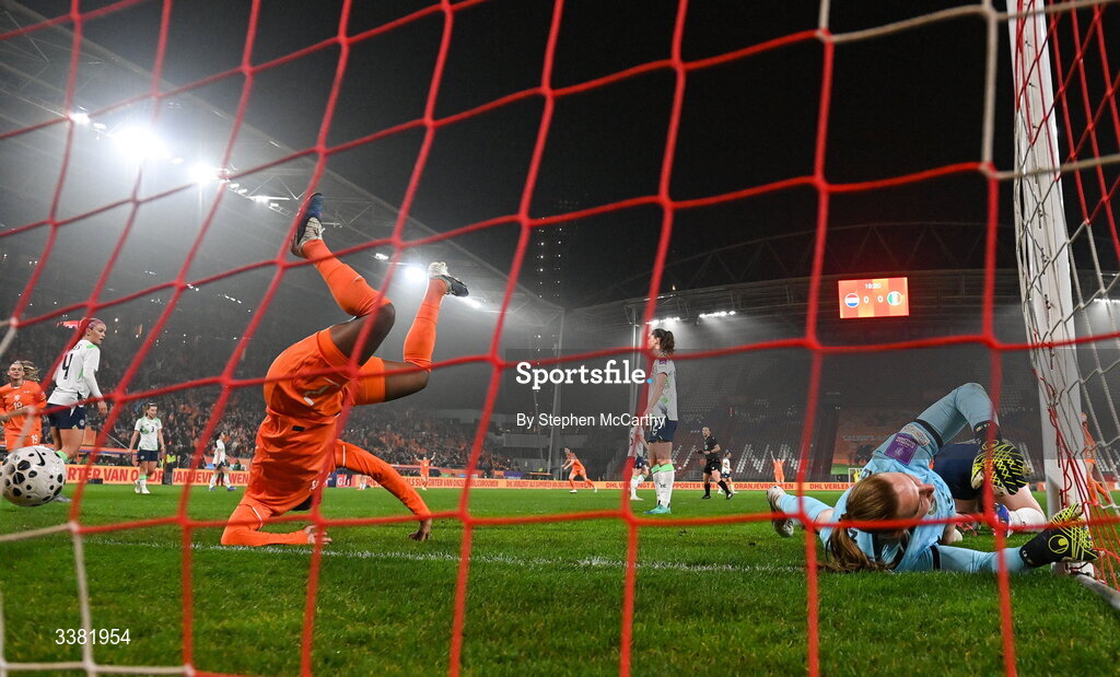 7 March 2026; Lineth Beerensteyn of Netherlands jumps over Republic of Ireland goalkeeper Courtney Brosnan after scoring her side's first goal during the 2027 FIFA Women’s World Cup Qualifier match between the Netherlands and Republic of Ireland at Stadion Galgenwaard in Utrecht, Netherlands. Photo by Stephen McCarthy/Sportsfile
