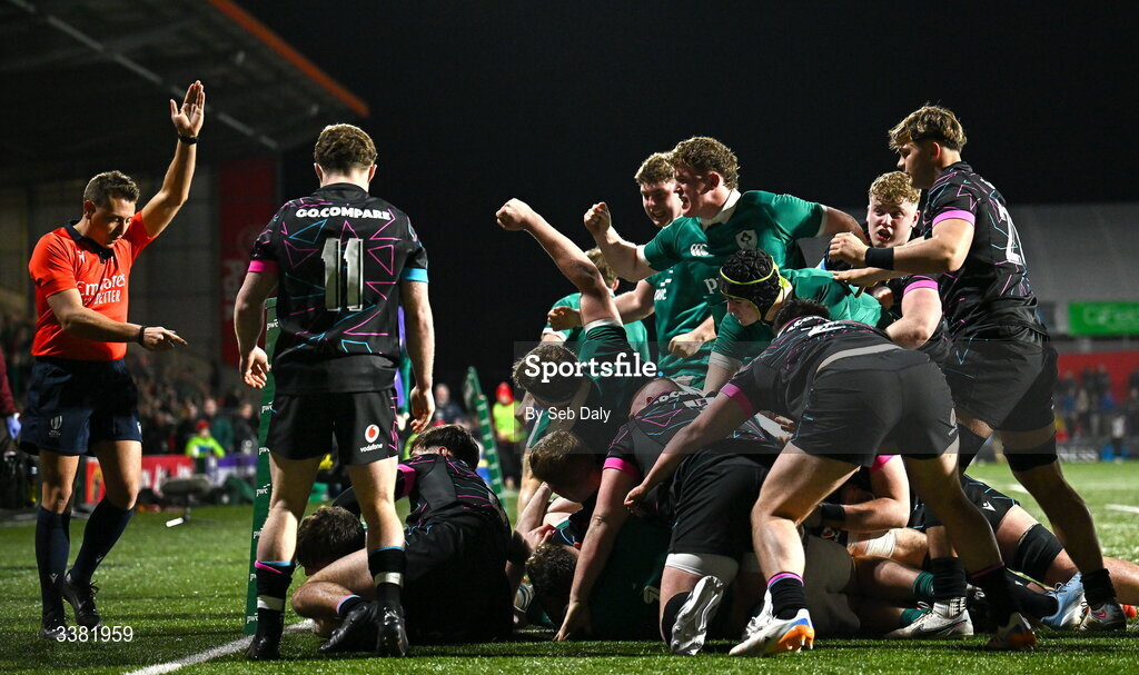 7 March 2026; Diarmaid O’Connell of Ireland, centre, celebrates his side's fifth try, scored by teammate Lee Fitzpatrick, hidden, during the U20 Six Nations Rugby Championship match between Ireland and Wales at Virgin Media Park in Cork. Photo by Seb Daly/Sportsfile