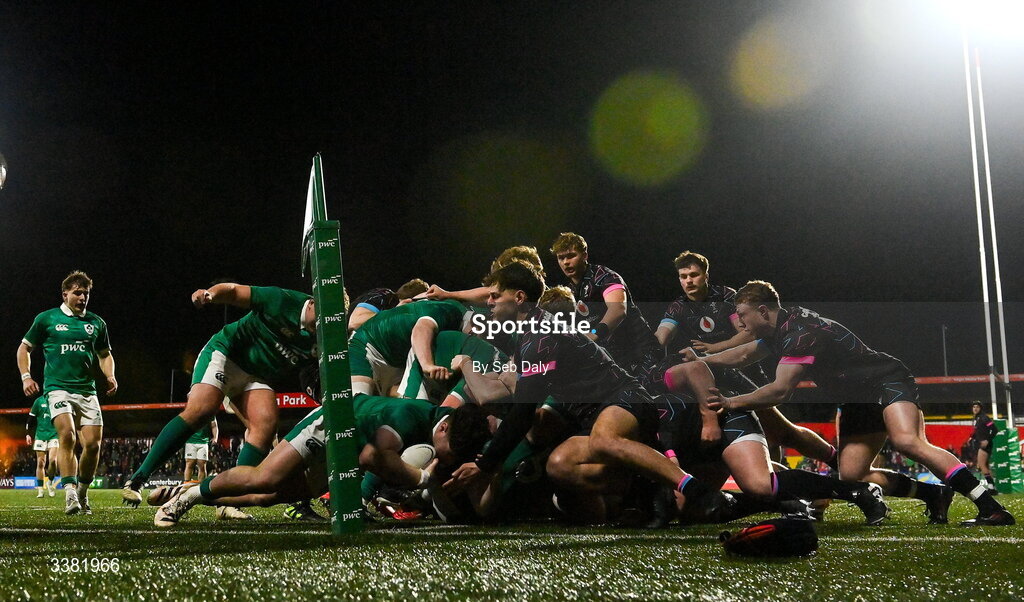 7 March 2026; Lee Fitzpatrick of Ireland, bottom left, scores his side's fifth try during the U20 Six Nations Rugby Championship match between Ireland and Wales at Virgin Media Park in Cork. Photo by Seb Daly/Sportsfile