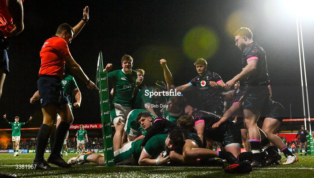 7 March 2026; Lee Fitzpatrick of Ireland, bottom, scores his side's fifth try during the U20 Six Nations Rugby Championship match between Ireland and Wales at Virgin Media Park in Cork. Photo by Seb Daly/Sportsfile