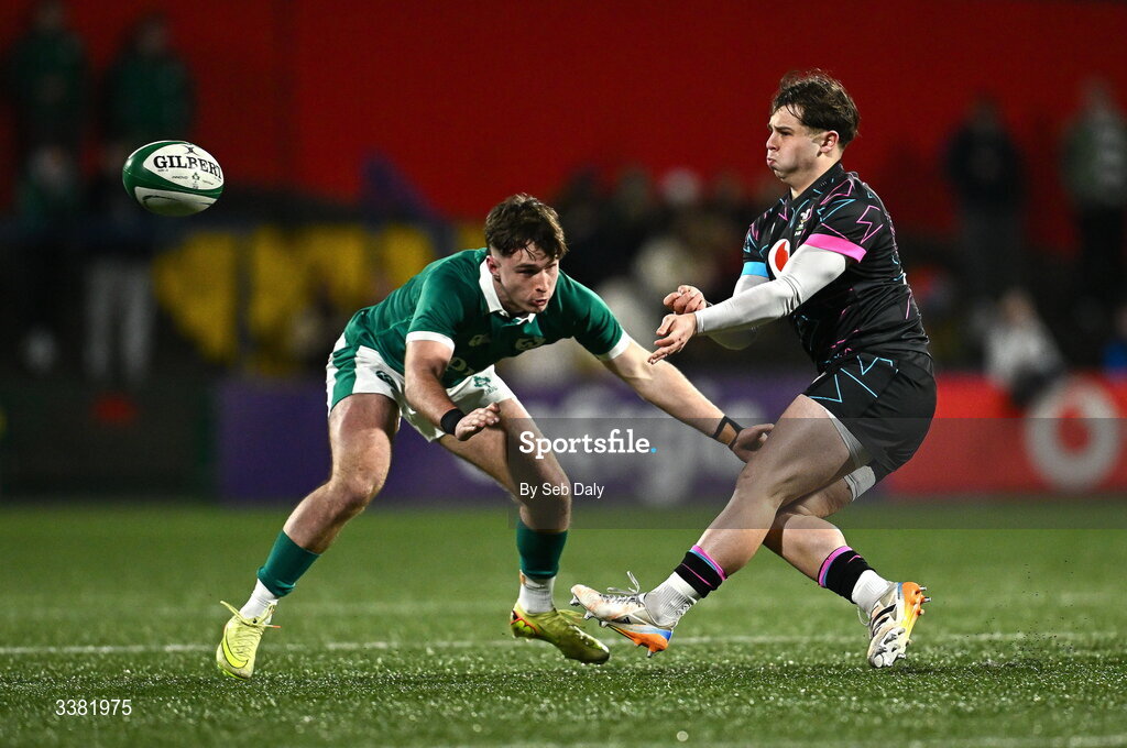 7 March 2026; Carwyn Leggatt-Jones of Wales in action against Derry Moloney of Ireland during the U20 Six Nations Rugby Championship match between Ireland and Wales at Virgin Media Park in Cork. Photo by Seb Daly/Sportsfile