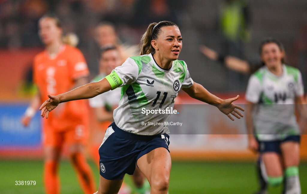 7 March 2026; Katie McCabe of Republic of Ireland celebrates after scoring her side's first goal, a penalty, during the 2027 FIFA Women’s World Cup Qualifier match between the Netherlands and Republic of Ireland at Stadion Galgenwaard in Utrecht, Netherlands. Photo by Stephen McCarthy/Sportsfile