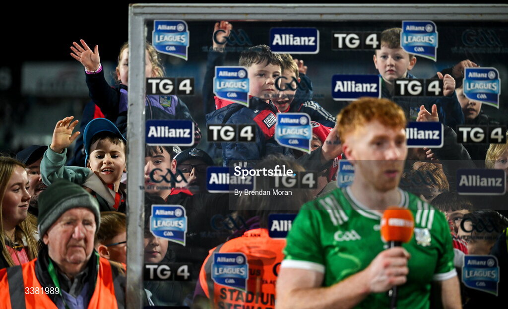 7 March 2026; Young supporters attempts to get themselves on television as Cian Lynch of Limerick is interviewed by TG4 after the Allianz Hurling League Division 1A match between Limerick and Cork at TUS Gaelic Grounds in Limerick. Photo by Brendan Moran/Sportsfile
