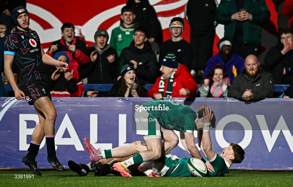 7 March 2026; Daniel Ryan of Ireland, right, celebrates with teammate Noah Byrne after scoring their side's sixth try during the U20 Six Nations Rugby Championship match between Ireland and Wales at Virgin Media Park in Cork. Photo by Seb Daly/Sportsfile
