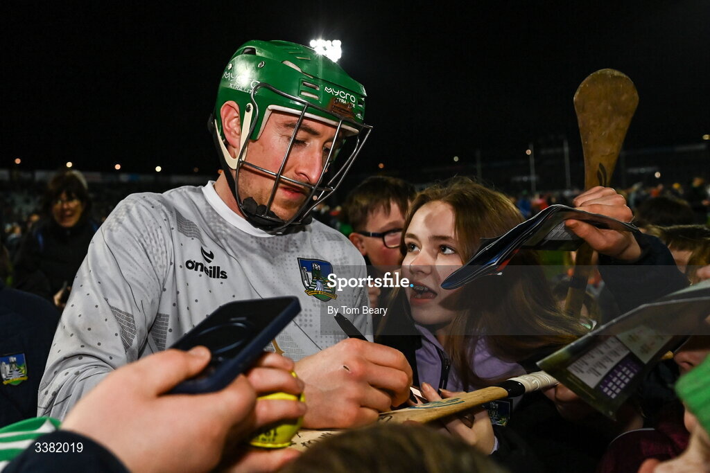 7 March 2026; Limerick goalkeeper Nickie Quaid signs his autograph on the hurl of a young supporter after the Allianz Hurling League Division 1A match between Limerick and Cork at TUS Gaelic Grounds in Limerick. Photo by Tom Beary/Sportsfile