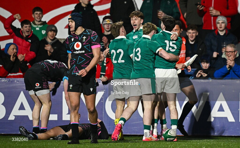7 March 2026; Daniel Ryan of Ireland, back, celebrates with teammates after scoring their side's sixth try during the U20 Six Nations Rugby Championship match between Ireland and Wales at Virgin Media Park in Cork. Photo by Seb Daly/Sportsfile